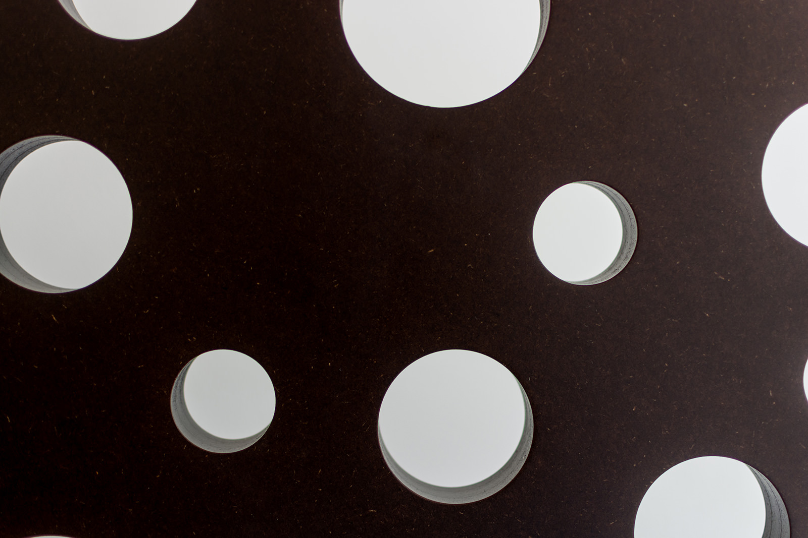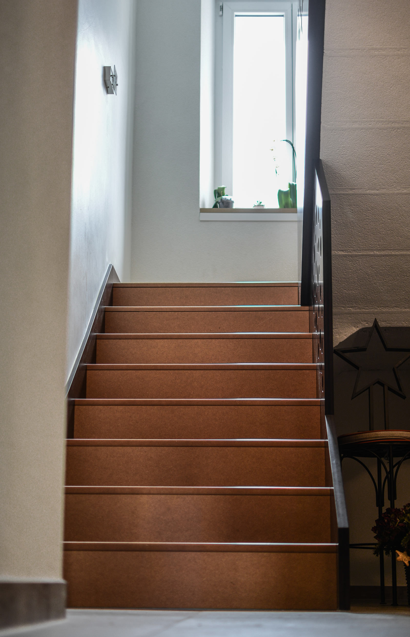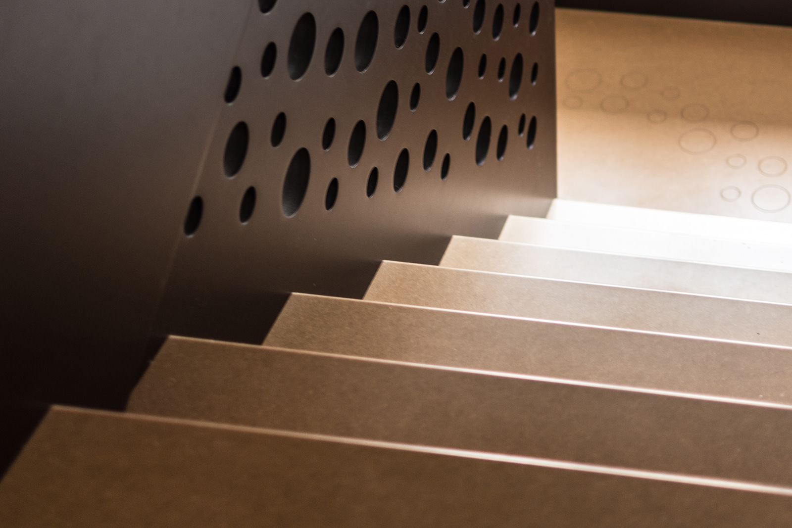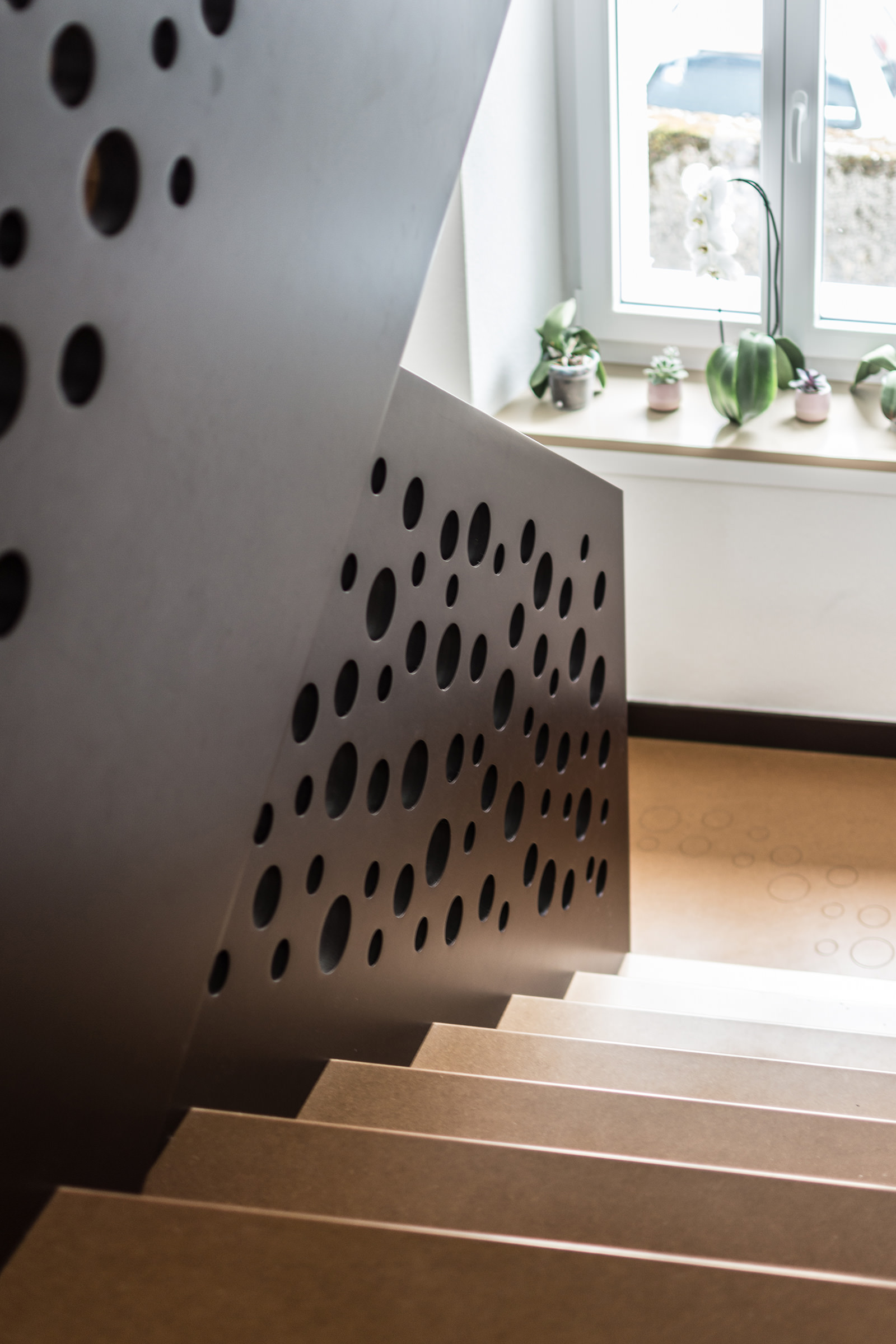 Reconstruction d’escalier contemporain habillant l’ancienne structure. Réalisation en MDF teinté dans la masse avec balustrades ajourées et motifs décoratifs sur paliers